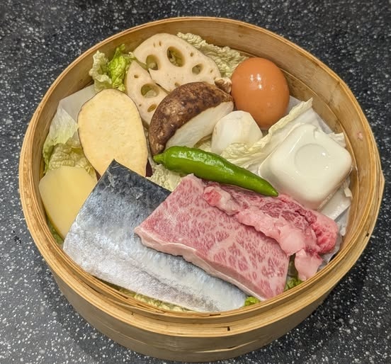 昼食/蒸篭蒸し(青菜:キャベツ、白菜、コマツナ…。根菜:レンコン、サツマイモ、カボチャ、…。果菜:ミニトマト、しし唐、オクラ、ナス。卵。魚:鯖、タラ、ニシン、タイ、…。肉:牛、豚、鶏、…。)